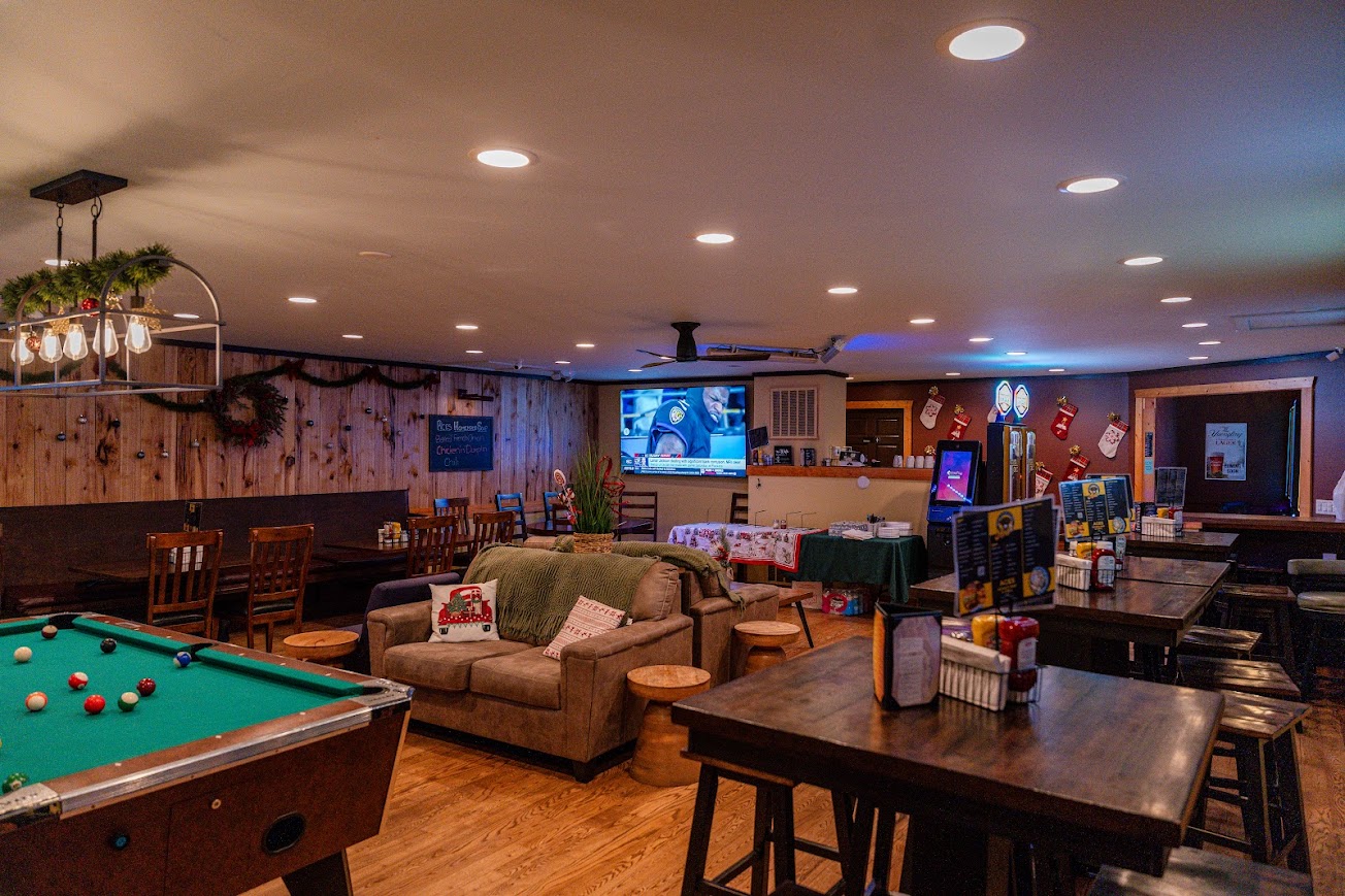 The big space has a pool table, games for kids, and many tables for big groups. You'll never miss a moment with 12 big-screen TVs showing all the action.